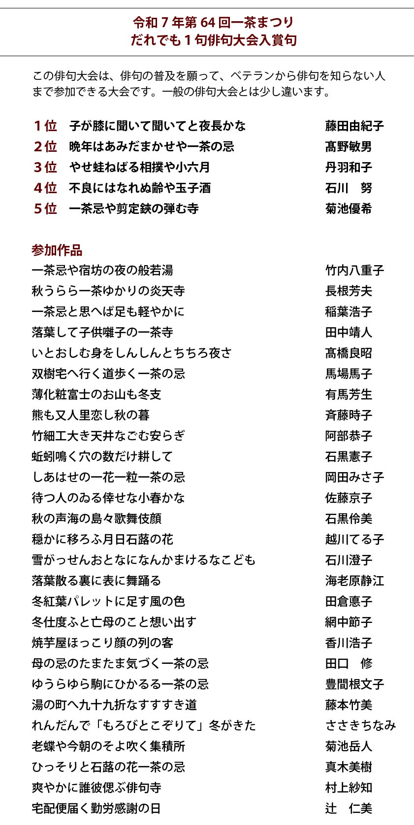 炎天寺は平安中期に源頼義、義家父子が建立したと伝えられている古刹。小林一茶は千住関屋に住んでいた建部巣兆を中心とした文化人たちとかかわり、竹の塚の作家・竹塚東子などとこの寺の周辺をよく歩き、「蝉鳴くや六月村の炎天寺」「やせ蛙負けるな一茶是にあり」などの句を残しました。炎天寺では昭和37年それらの句碑を境内に建て、一茶の命日である11月19日に地元の有志が「一茶まつり」として一茶を偲ぶ法要と石田波郷氏を特別選者に句会を開いたのが始まりです。現在は